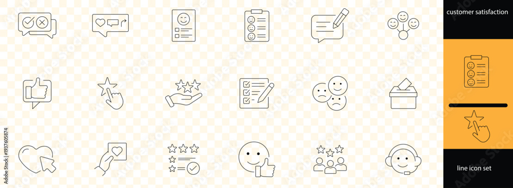 Customer satisfaction line icons set, feedback concept. Rating, approval, performance, enjoyment, and opinion symbols. Editable stroke #1937605874