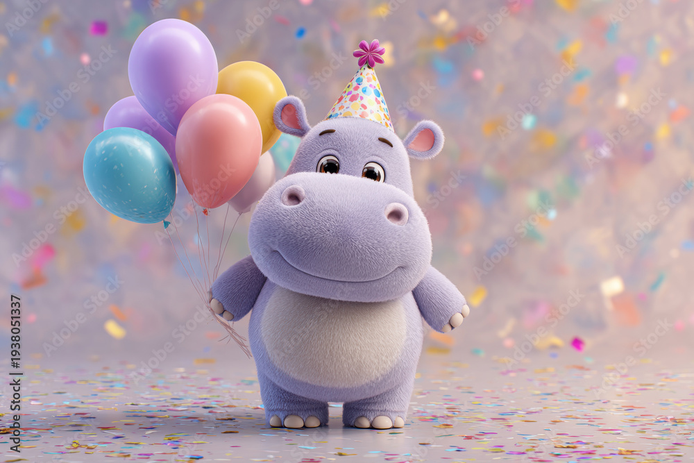 Cute baby hippo wearing party hat and holding colorful balloons celebrating birthday with flying confetti #1938051337