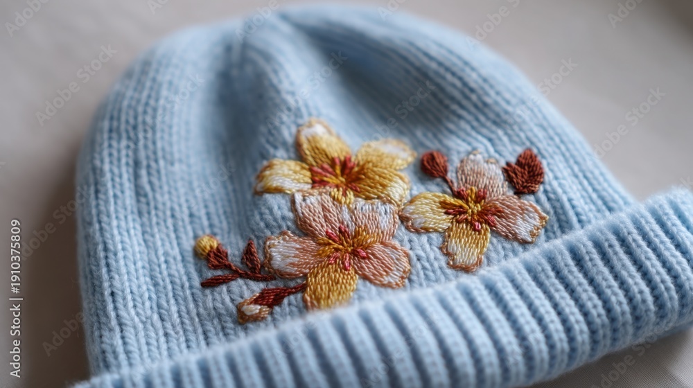 • #1910375809 Cute blue knit beanie with colorful flower embroidery perfect for winter fashion and cozy accessories for cold weather