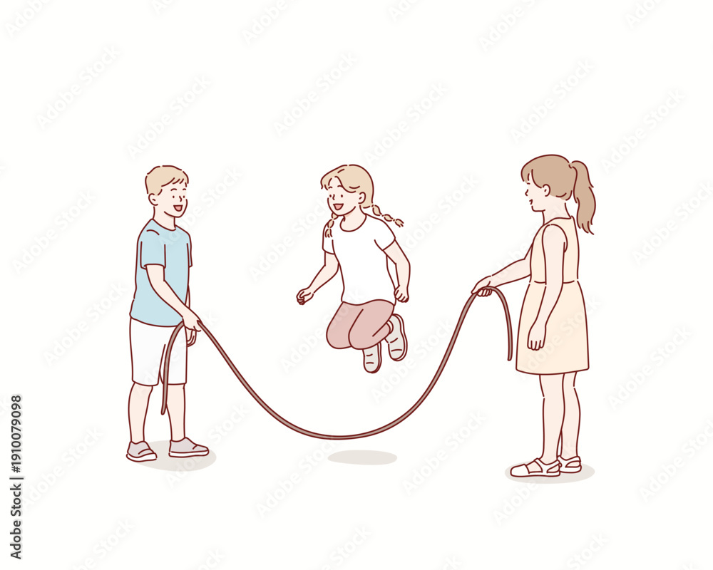 Cute boys and girls play jumping on a rope. Original vector illustration drawn by hand. #1910079098