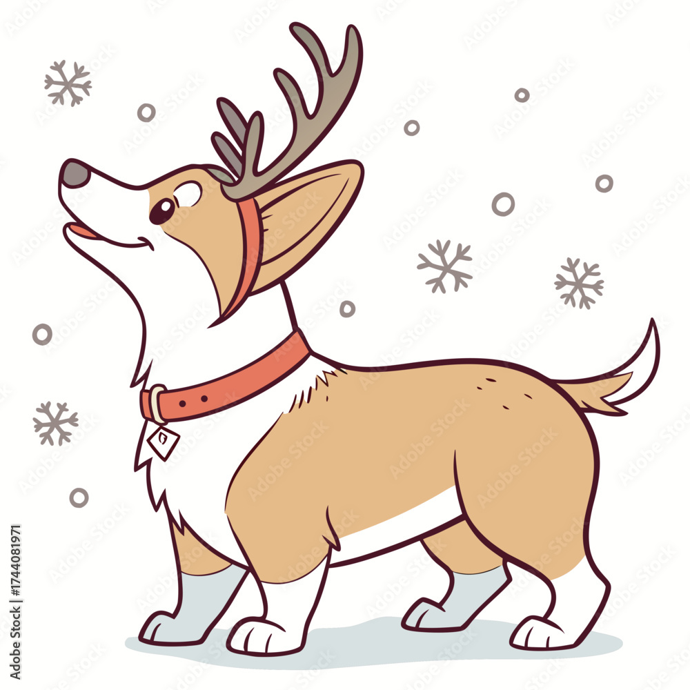 Cute cartoon corgi dog wearing reindeer antlers and a festive collar standing in the snow with snowflakes falling around it perfect for holiday greetings and winter themes #1744081971