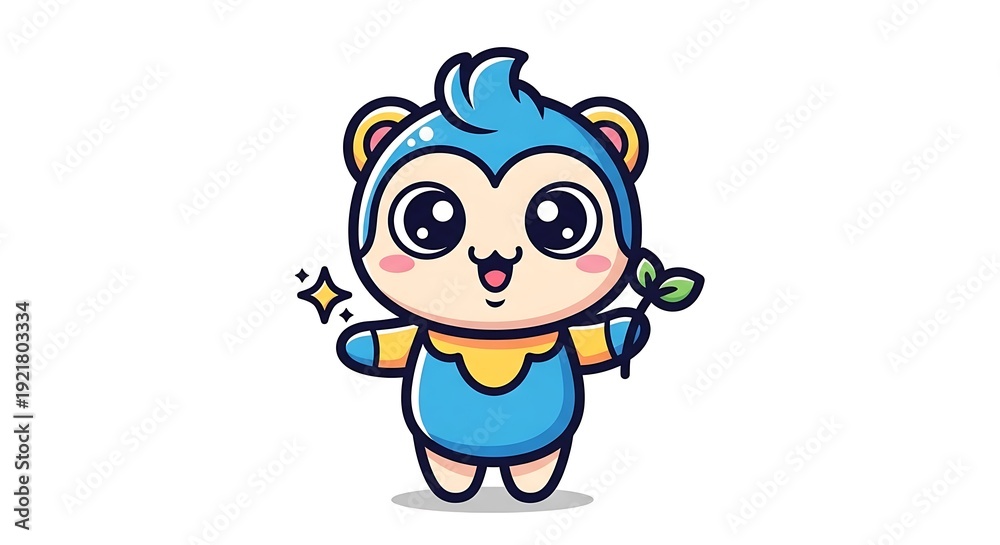 Cute cartoon monkey character with big eyes and a friendly smile, holding a green leaf sprout, symbolizing growth, nature, and adorable children's themes. #1921803334