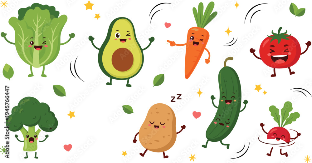 Cute cartoon vegetable characters vector set with avocado, carrot, tomato, cucumber, broccoli, potato and radish funny mascots #1945766447