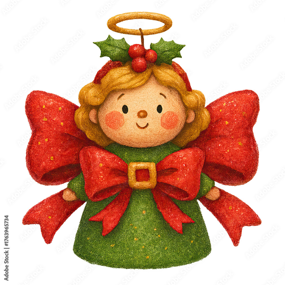 Cute Christmas angel figure with halo, golden hair, green dress, and large red bow #1763965734