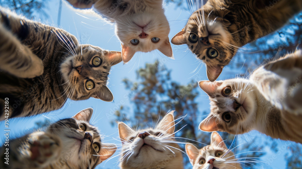 Cute Circle of Eight Curious Cats Huddled, Gazing Down at Ground Camera, Sunny Day Close-Up #794292180