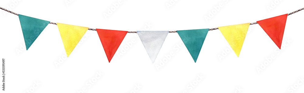 Cute, colorful garland with decorative holiday flags. Yellow, green, red and white. Watercolor illustration isolation on transparent #533595497