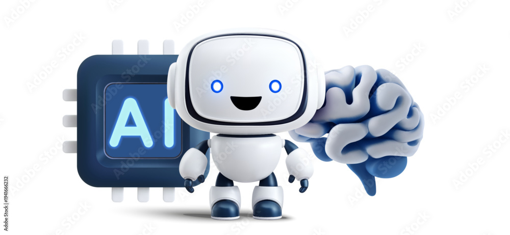 Cute 3D AI robot character with microchip and brain symbols, representing artificial intelligence, machine learning, smart automation, digital assistants, and future technology. #1941666232