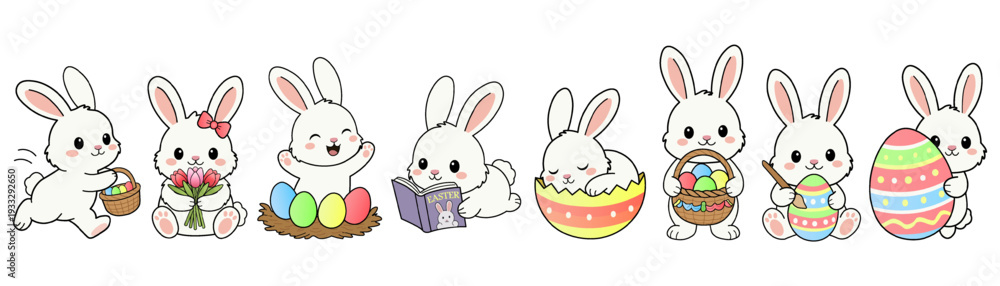 Cute Easter bunny character set. Kawaii white rabbit collection with Easter eggs and baskets in flat vector style #1933292650