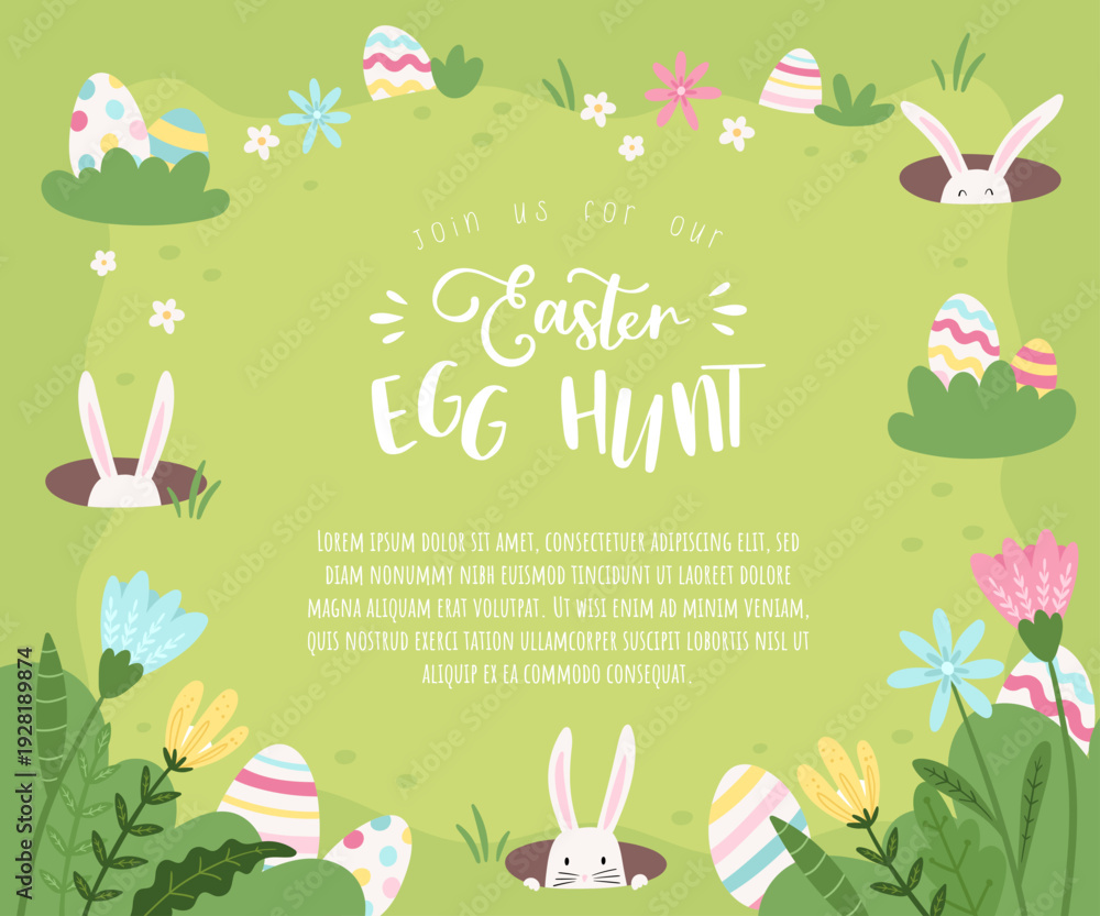 Cute Easter Egg hunt design, hand drawn with cute bunnies, eggs and decorations - great for invitations, banners, wallpapers - vector #1928189874