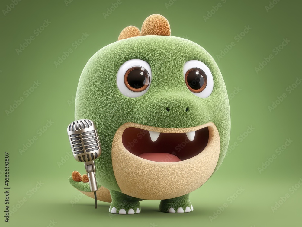 Cute green dinosaur performing, microphone, green screen, joyful expression, ideal for kid's videos - mesozoic background cheerful #1665590807