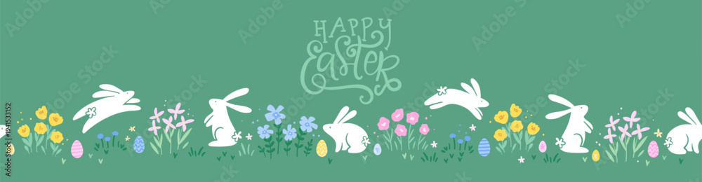 Cute hand drawn Easter seamless pattern with bunnies, flowers, easter eggs, beautiful background, great for Easter Cards, banner, textiles, wallpapers - vector design #1941533152