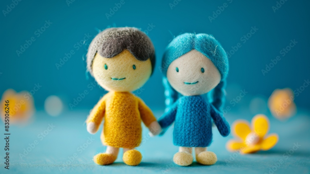 Cute handmade felt dolls boy and girl in colorful outfits with a blue background #835106246