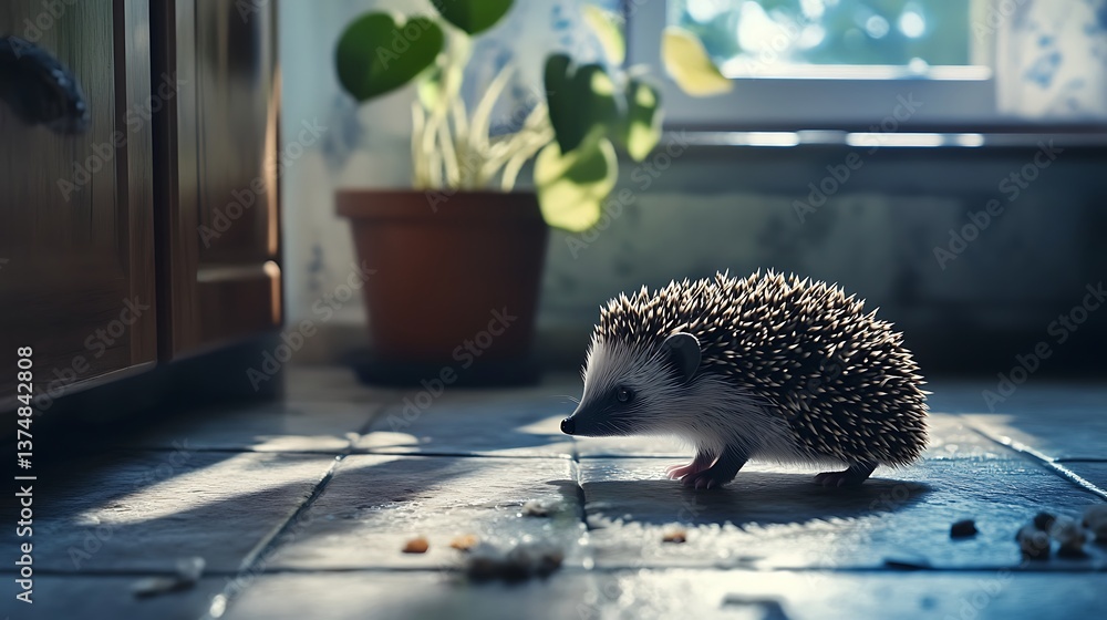 Cute hedgehog exploring a cozy kitchen floor with sunlight streaming through a window, surrounded by natural elements and soft textures #1374842808