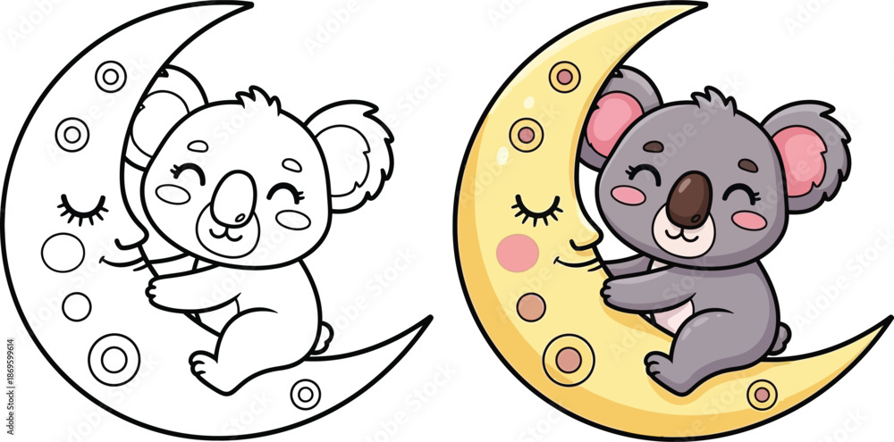 Cute koala on moon coloring pages for kids, cute little koala sleeping on moon, coloring book, vector Illustration for coloring book pages or Kids #1869599614