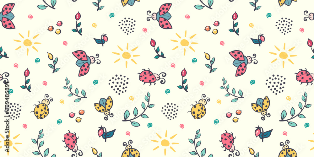 Cute ladybug seamless pattern. Ladybird cartoon character childrens illustration. Lady-beetle floral summer vector pattern with insects, sun, plants for kids, baby, textile, fabric, packaging #409485891