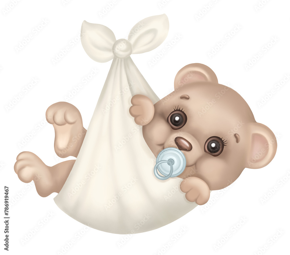 Cute Newborn Baby Bear in Bag, Funny Pregnancy Announcement, Teddy Bear Baby Shower Invitation Card, Newborn Congratulations, It's a Boy kids poster, New baby arrival design, Hand drawn Illustration #786919467