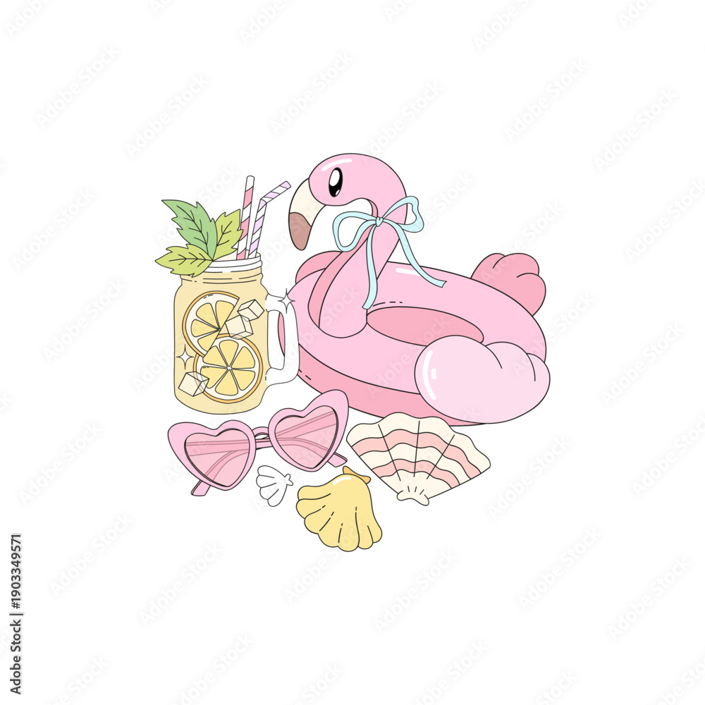 Cute Pastel Flamingo Pool Float Illustration with Lemonade, Sunglasses and Seashells for Summer Beach Decor, Apparel, Stationery and Lifestyle Designs #1903349571