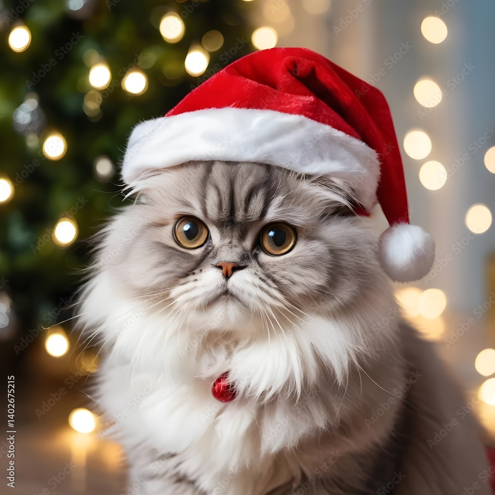 Cute Persian Cat Wearing Santa Hat by Christmas Tree #1402675215