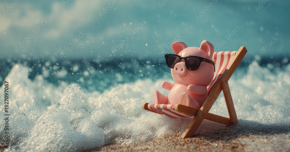 Cute Piggy Relaxing on Beach Chair with Sunglasses. #1927097067