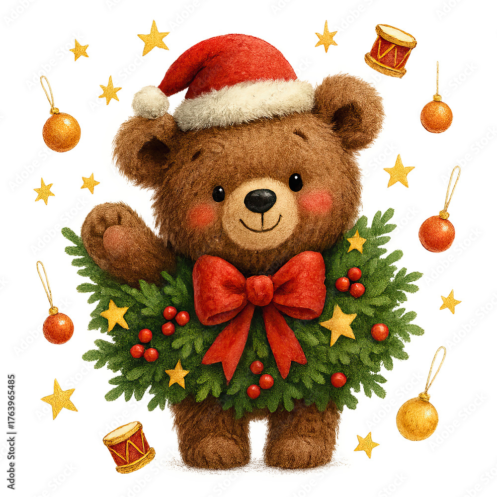 Cute plush bear wearing Santa hat, nestled in Christmas wreath with red bow, berries, stars, and ornaments #1763965485