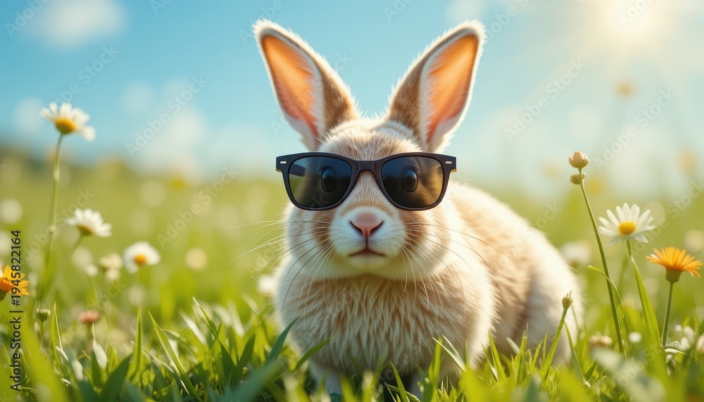 Cute Rabbit Wearing Sunglasses Relaxing in a Sunny Flower-Filled Meadow During Daytime #1945822164
