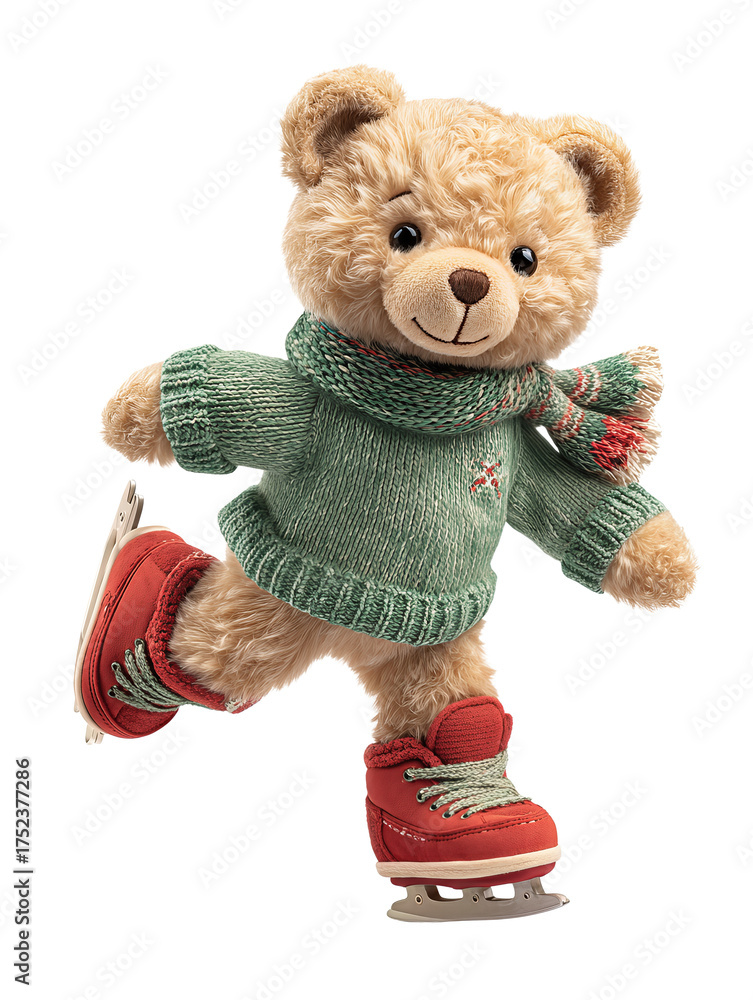 Cute skating teddy bear plush wearing a green knit sweater, red skates, and a fluttering scarf, embroidered smile, isolated on transparent background. #1752377286