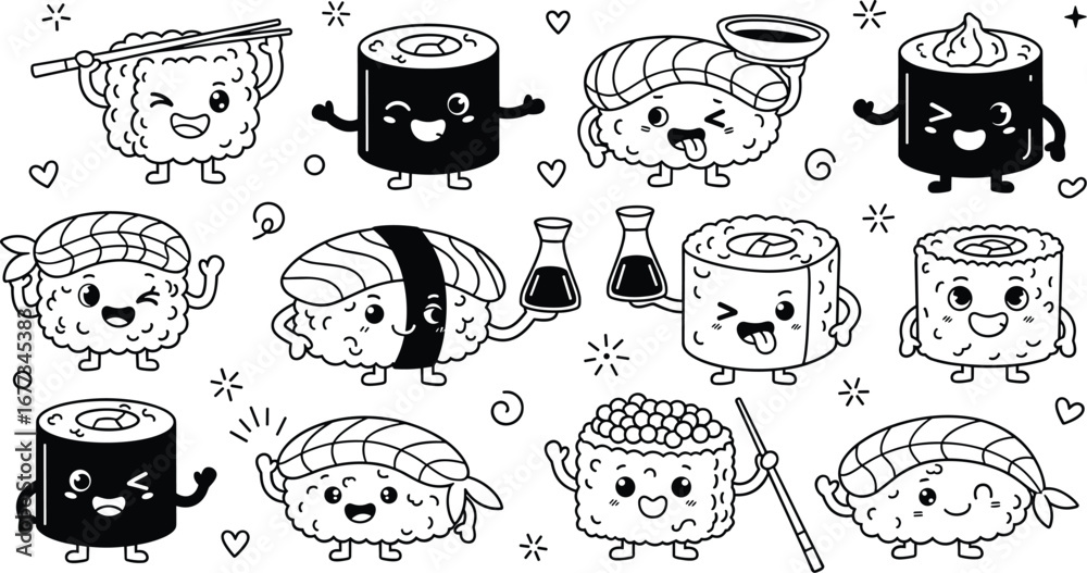 Cute sushi characters with happy expressions. Asian cuisine, food, kawaii, cartoon, restaurant, meal, japan, sushi art, sticker #1677345383