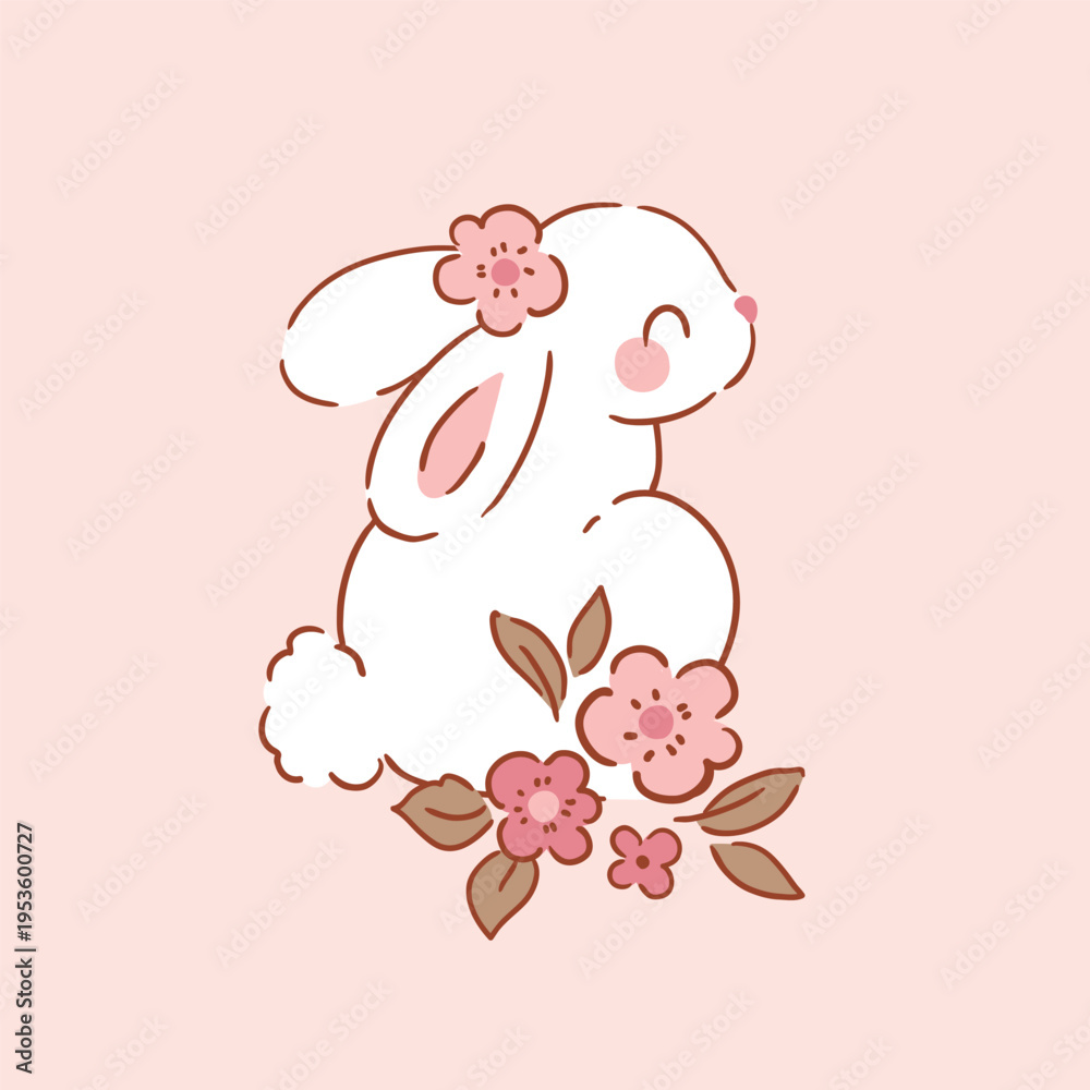 Cute white rabbit with spring floral arrangement. Hand drawn vector clipart. Easter bunny on isolated background. #1953600727