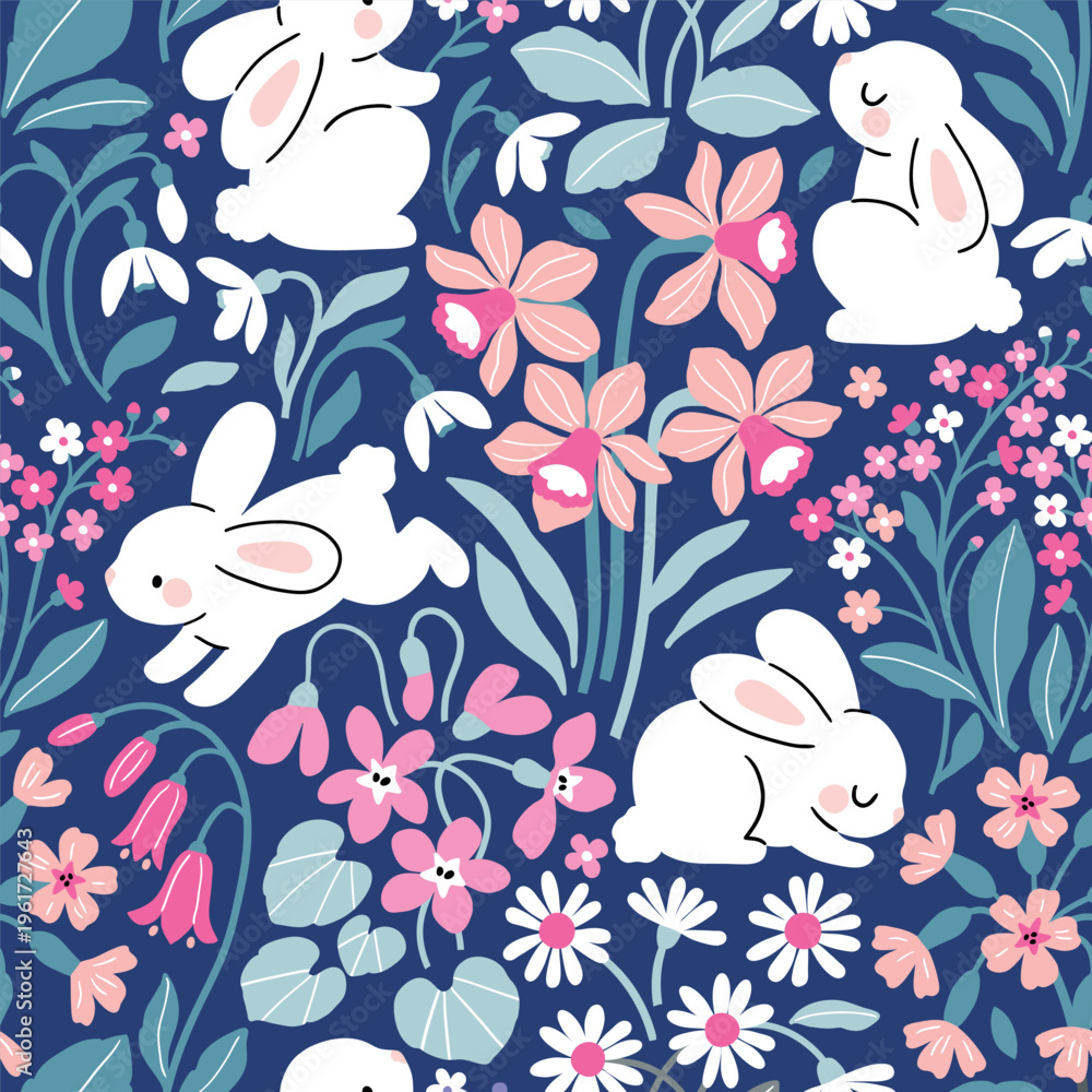 Cute white rabbits on spring floral background. Seamless vector pattern. Hand drawn Easter bunny pattern. #1961727643