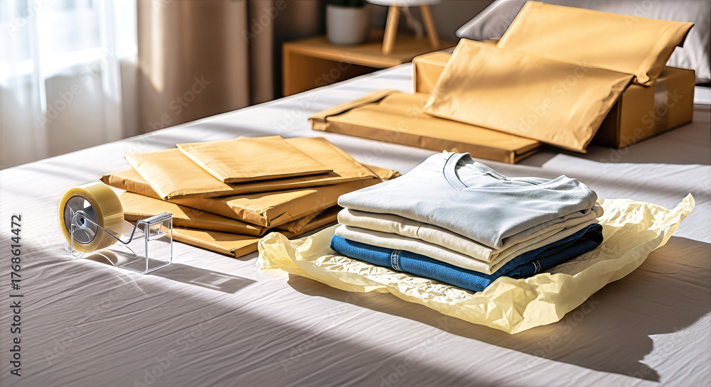 Cyber Monday sale featuring kraft mailers and tissue paper in bedroom setting. Cyber Monday sale items are presented with natural light enhancing soft textures and highlighting product details. #1768614472
