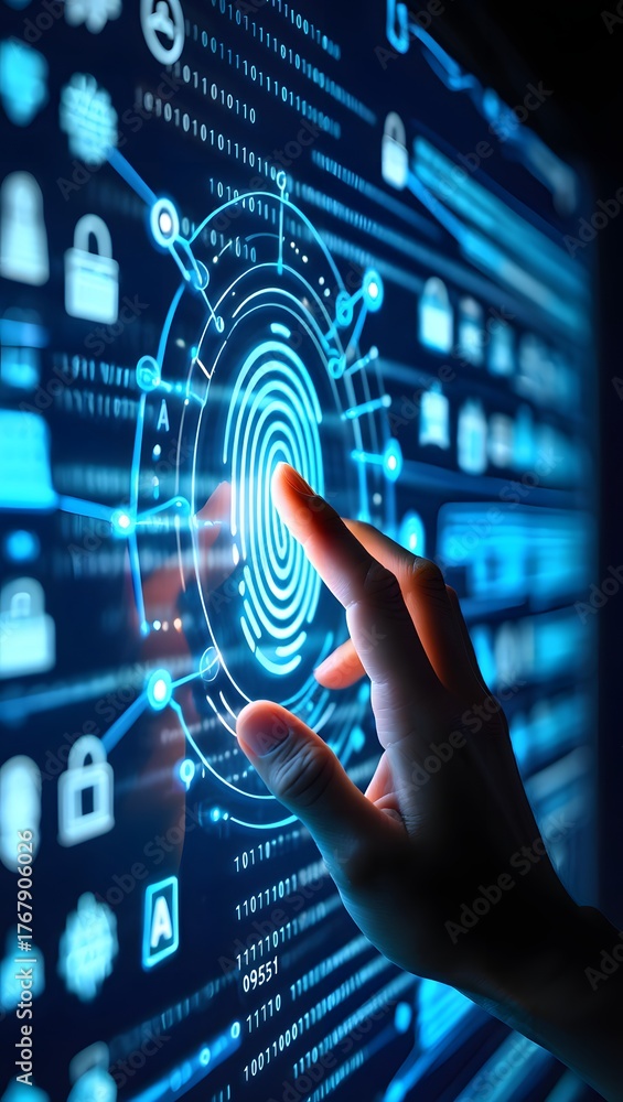 Cyber security system and data protection concept. Man using fingerprint scanning access data with data center as background, biometric identity, data encryption for network security of cyber attack #1767906026