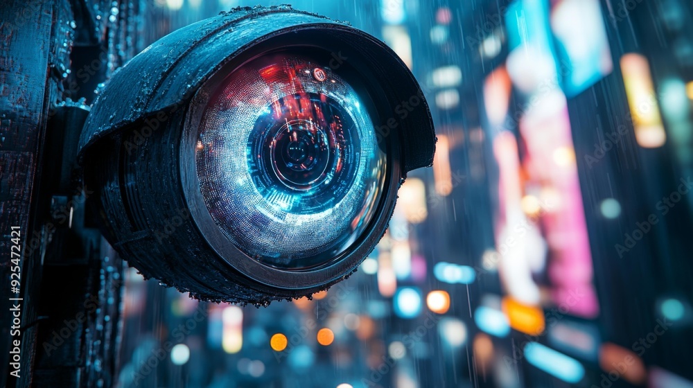 Cyber surveillance lens in the rainy neon cityscape - generative ai #925472421