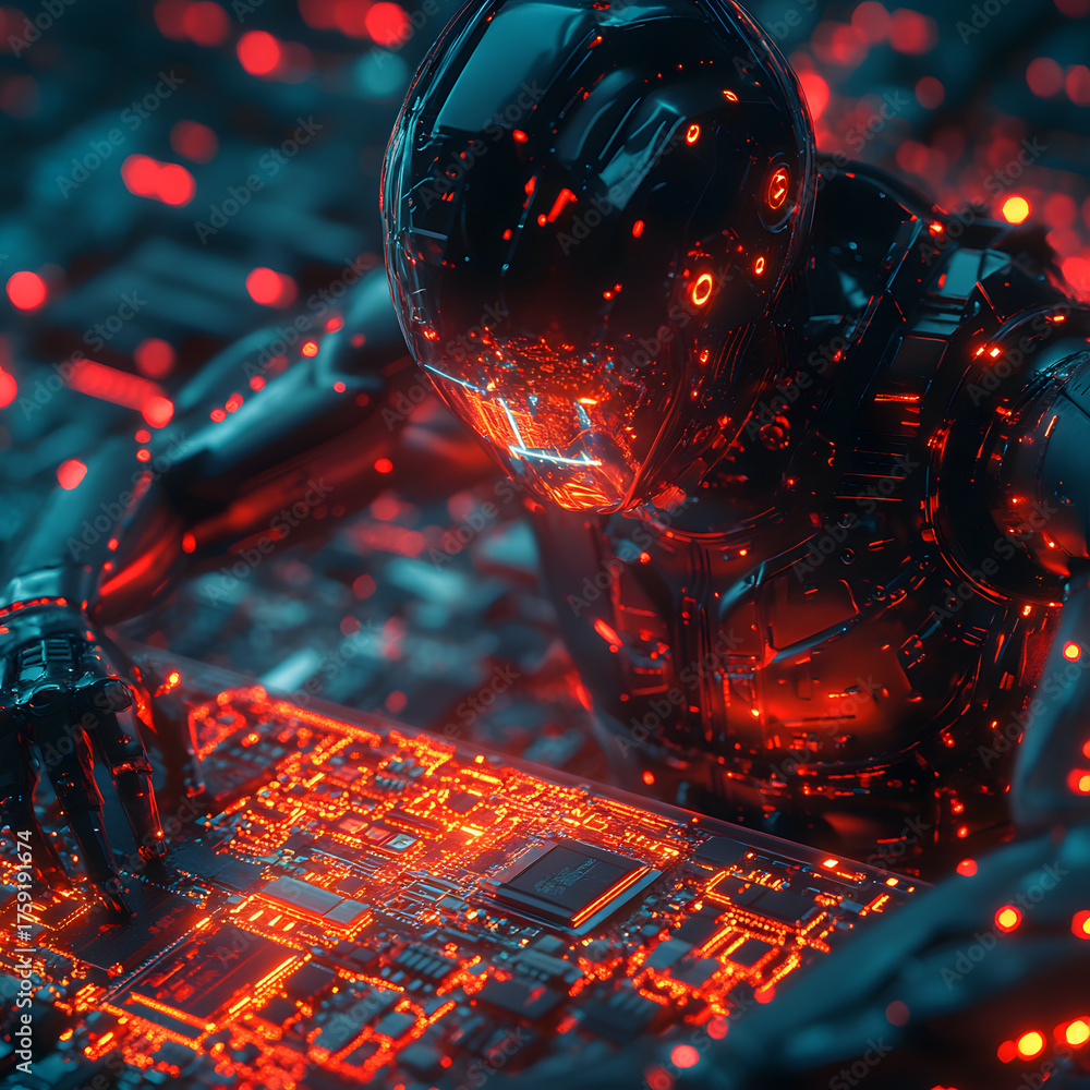 Cybernetic robot in sleek design installing PC-WARE processor while neon light reflects off circuit board #1759191674