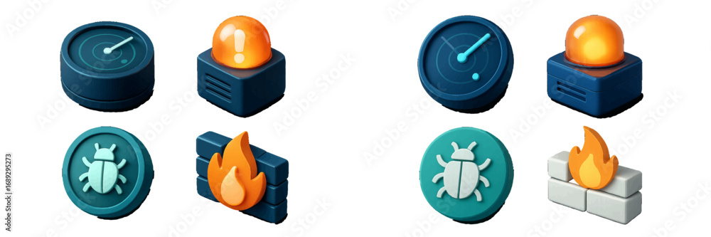 Cybersecurity 3D icon set with firewall, virus bug detection, network scanner, and alert symbols for digital protection and internet safety #1689295273