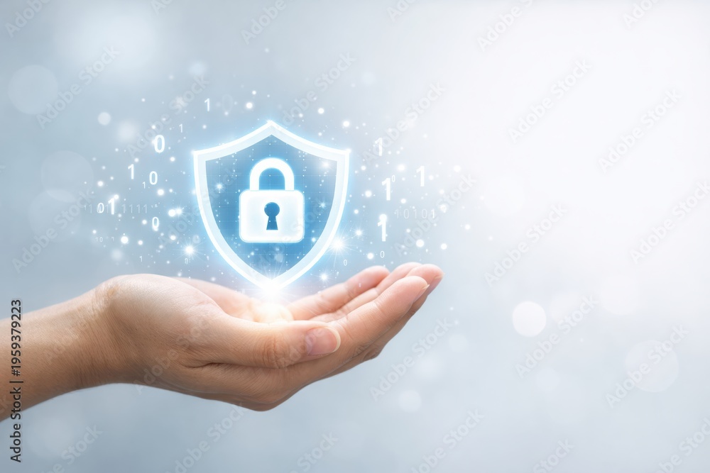 Cybersecurity Shield: A digitally rendered glowing shield with a padlock floats delicately above an open hand, illustrating concepts of security, protection, and data privacy. #1959379223