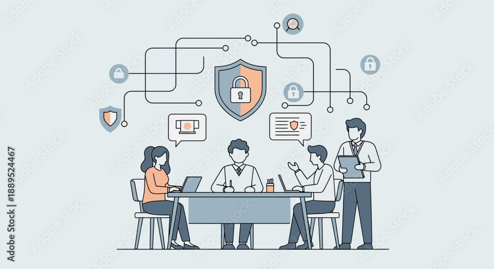Cybersecurity team meeting discussing data protection and network security. #1889524467