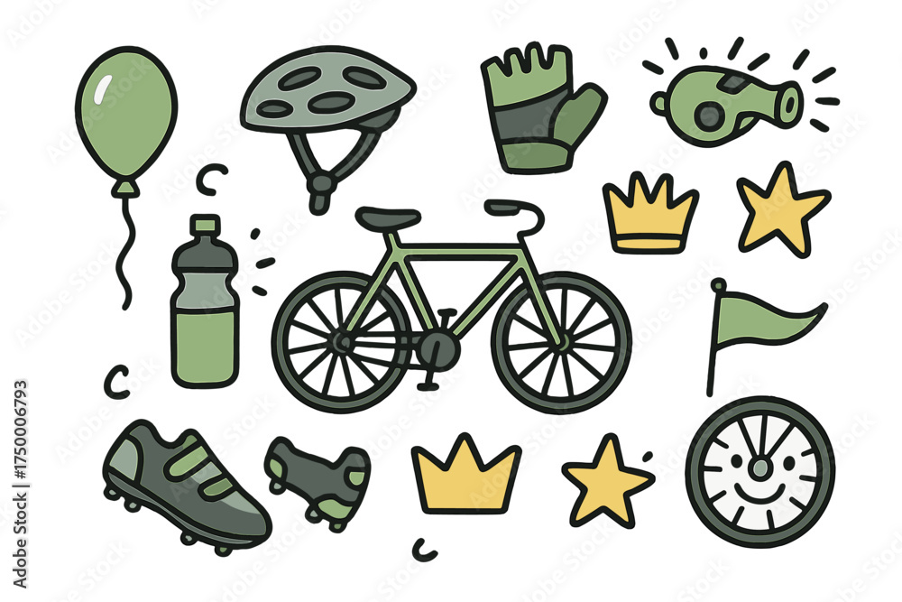 Cycling Adventure Icons. Cycling doodle icon set: hand drawn icons of bike, helmet, shoes, bottle, gloves, whistle, crown, star, #1750006793