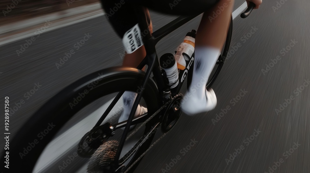 Cyclist propelling modern road bike forward on asphalt road. Cyclist riding bicycle with motion blur, emphasizing speed, fitness, and movement #1928987580