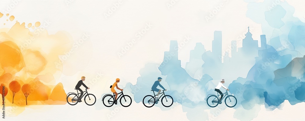 Cyclists on a city street, everyday commute, urban backdrop, Watercolor style #899733966