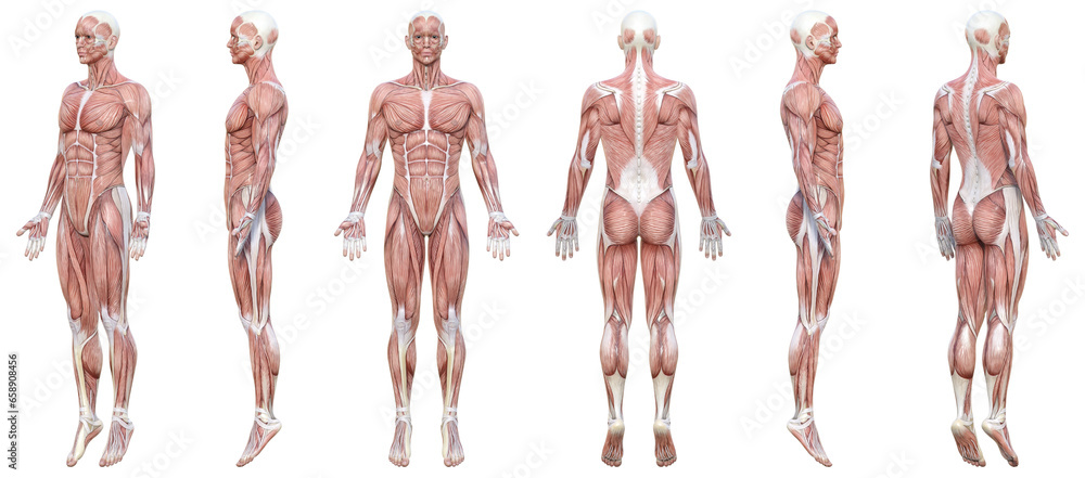 筋肉解剖図の男性3Dイラスト 全身正面 横向き 背面 ポーズ素材 #658908456