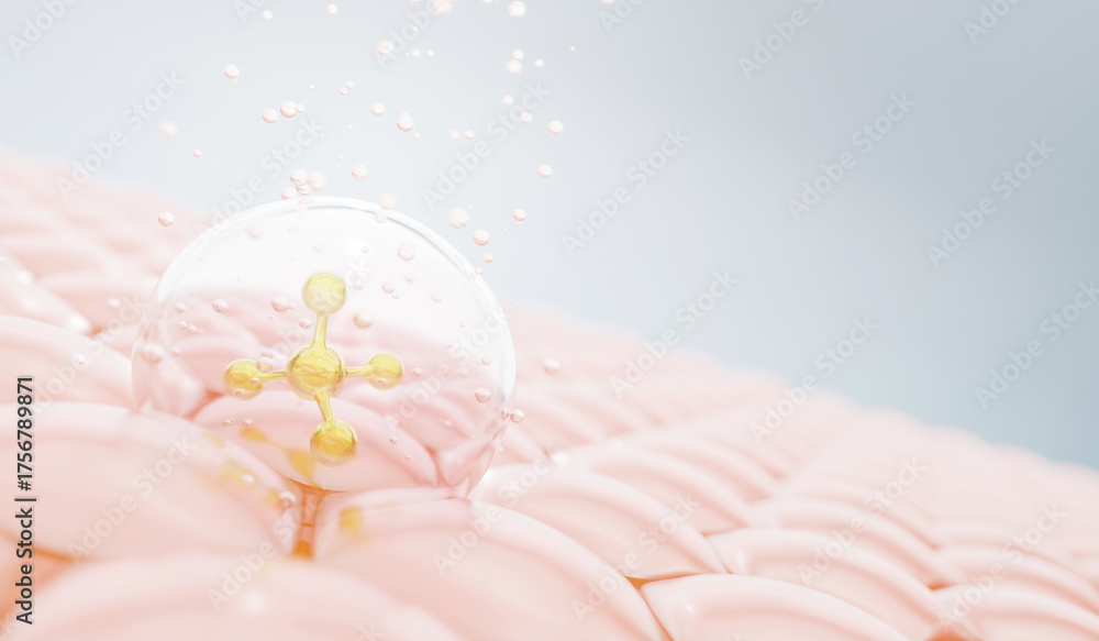 3D active serum droplet penetrating skin cells with golden molecule inside. Ideal for skincare, rejuvenation, and anti-aging visuals. #1756789871