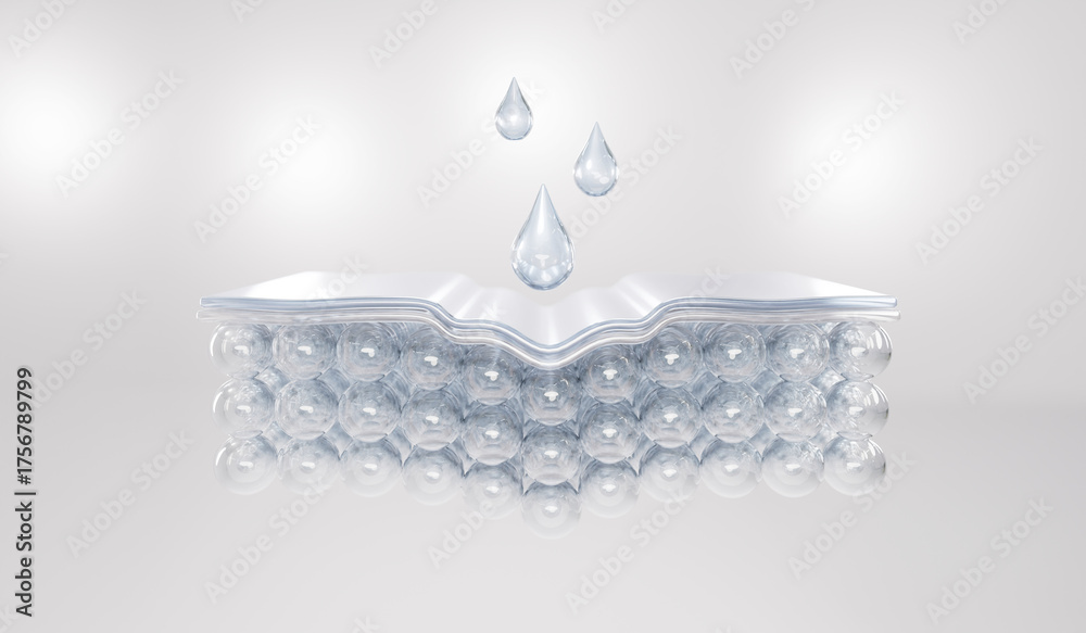 3D cross-section of skin layers absorbing serum drops. Perfect for hydration, skincare technology, and cosmetic moisture lock visuals. #1756789799
