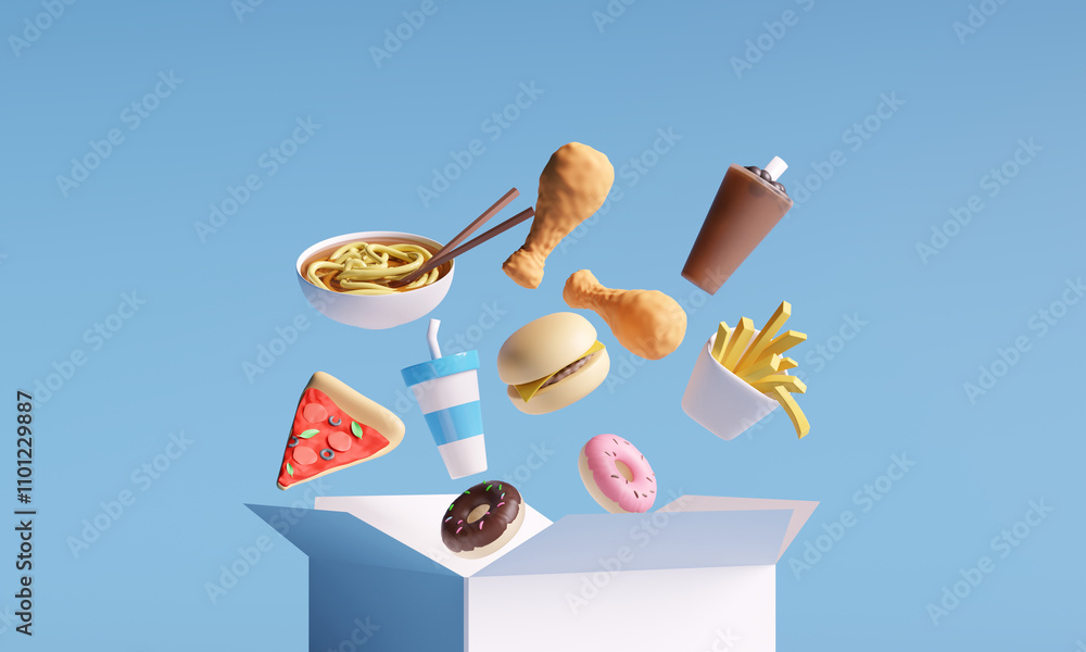 3D food icons. Food box, noodles, fast food, and drink. Donut, burger, pizza, chicken, and french fried on a blue background. 3d rendering #1101229887