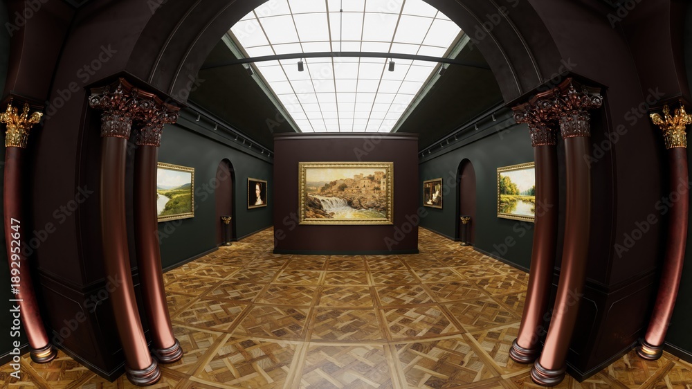 3d interior of old museum art gallery. Artworks in a bright, spacious gallery. 3d illustration. #1892952647