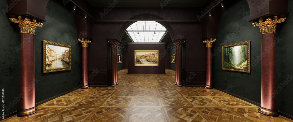 3d interior of old museum art gallery. Artworks in a bright, spacious gallery. 3d illustration. #1912594999