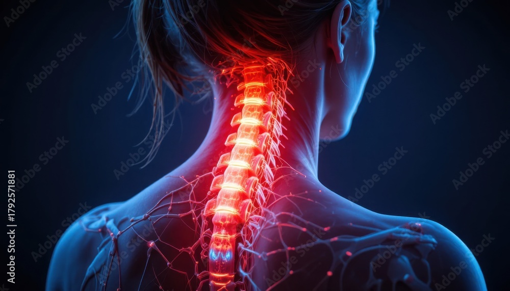 3D medical illustration of a human body anatomy showing a red heart and spinal backbone against an abstract black smoke background #1792571881