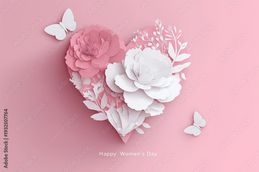 3D paper-cut heart with white and pink flowers and butterflies for a happy women's day card background template on pastel background. #1932507764