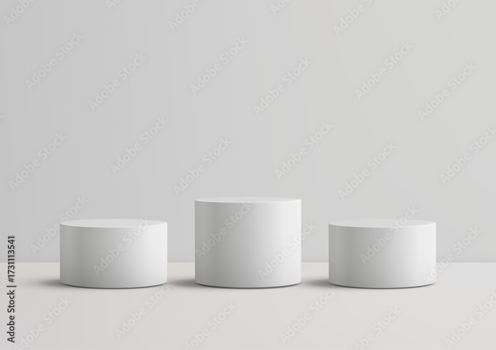 3d podium mockup with three white cylindrical pedestals for product display background minimal stage design clean showroom neutral geometry template presentation #1731113541
