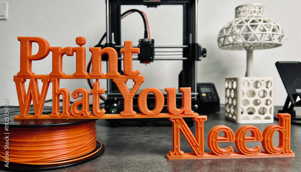 3D Printed Orange Objects and Printer on Desk Maker Workshop Setup. #1925736741