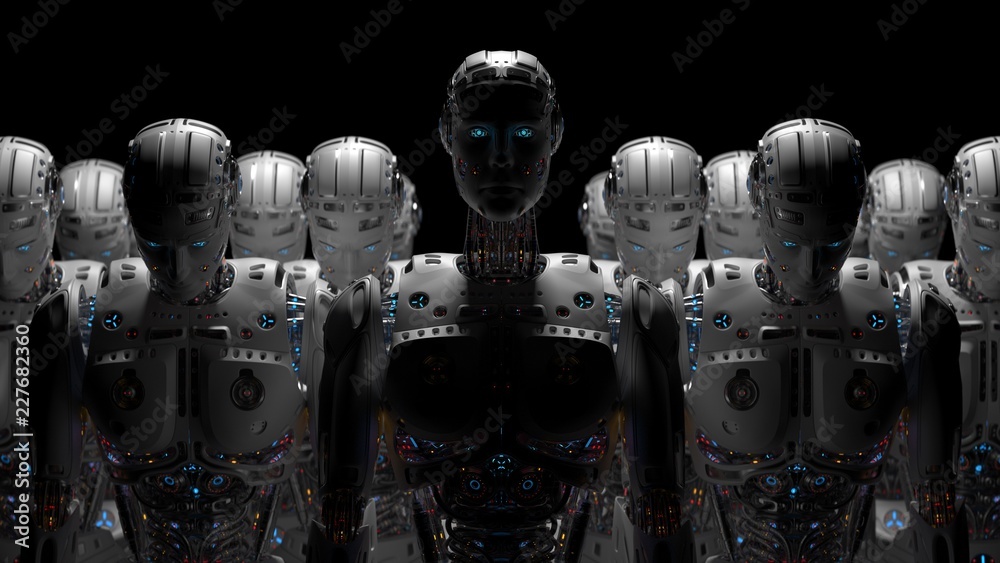 3D Render Futuristic Robot army or group of cyborgs on black background #227682360